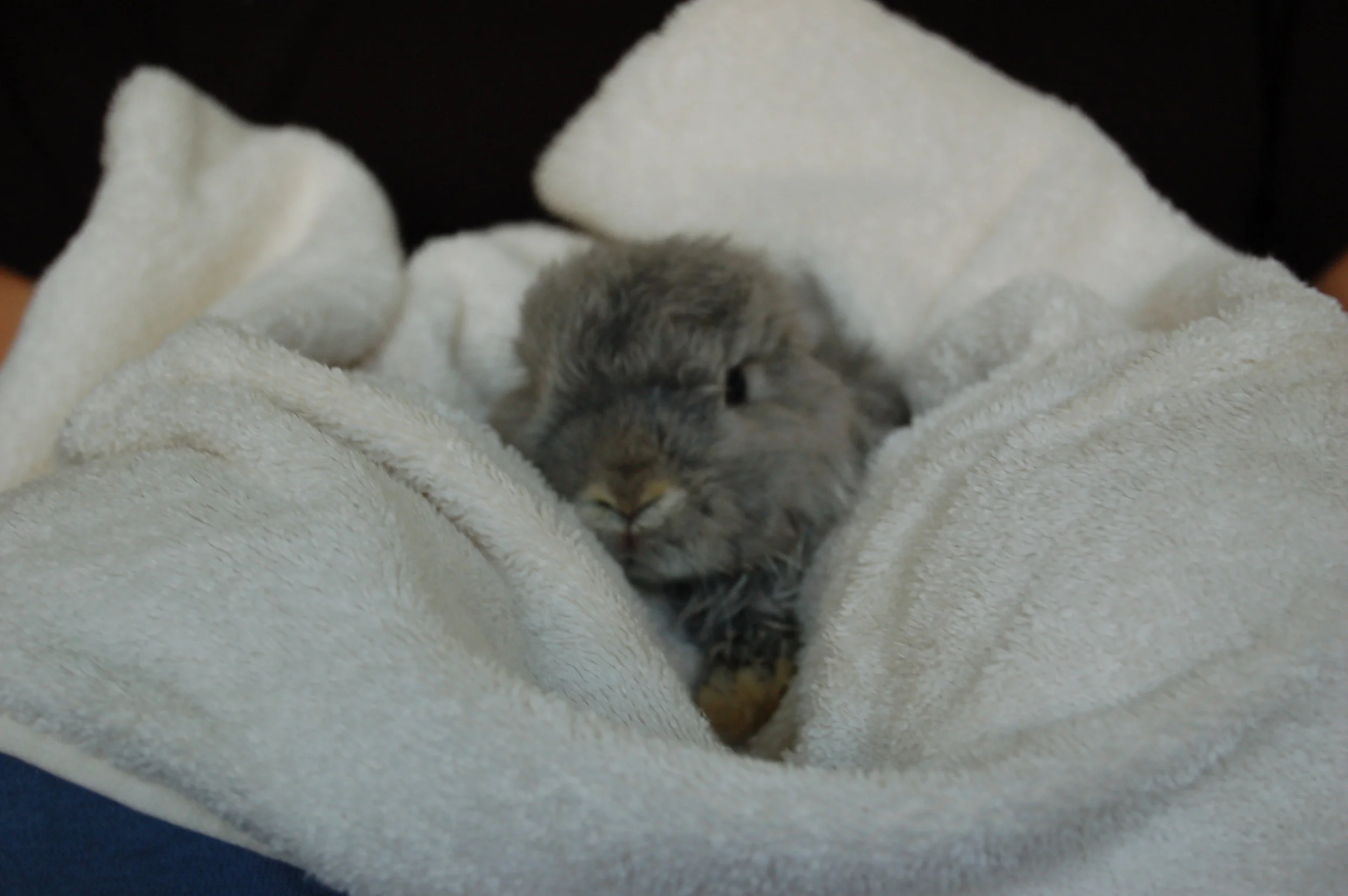 The rinsing process will likely take longer than you think because the undercoat really holds soap. Use the same techniques as described above, using just wet hands for the head and face. Once your bunny is fully rinsed off, pick it up and immediately wrap it in a towel.