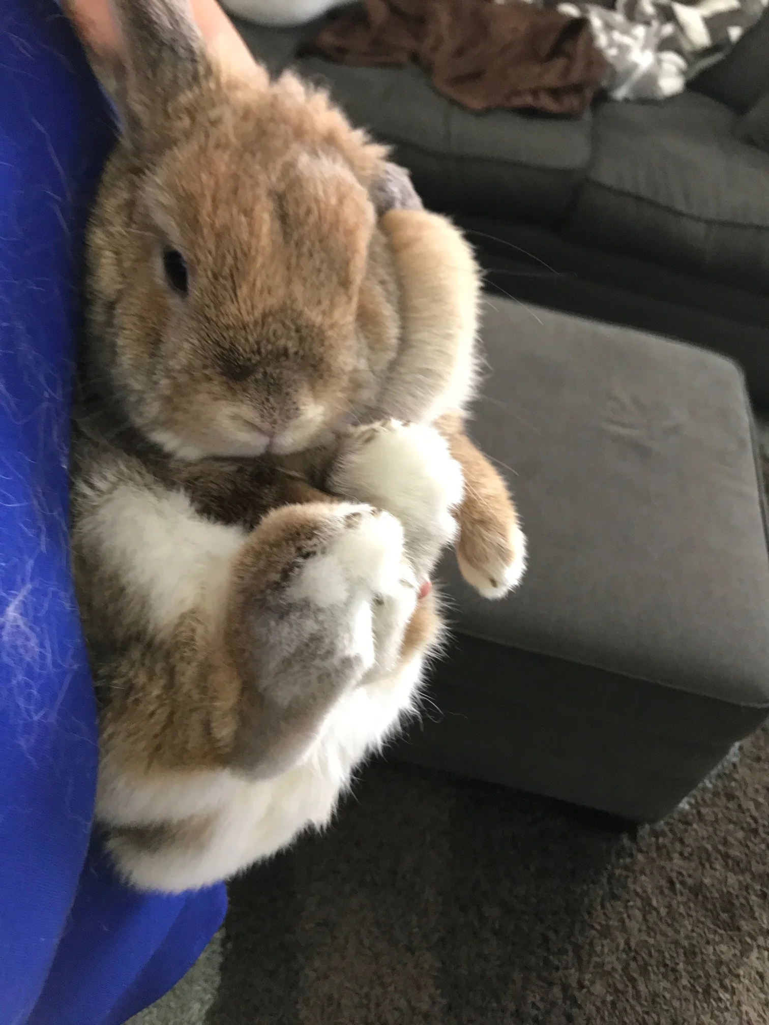 She is definitely a sweet bunny! She is doing well. She likes to get her fresh veggies and food from the kids, even hangs out by the fridge in anticipation. When I am in the living room her preferred place to sit is on the the back cushion of the chair and my shoulder like a parrot! But she'll sit on my husband's lap and make him pet her head. Quite the entertaining bunny!